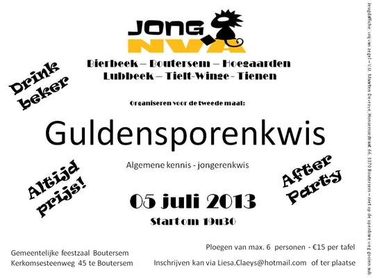 Vanaf 19u30 zullen de jong N-VA'ers van de afdelingen Bierbeek, Boutersem, Hoegaarden, Lubbeek, Tielt-Winge en Tienen jullie algemene kennis duchtig op de proef stellen.Er is voor iedereen een mooie prijs voorzien en om de quizavond compleet te maken is er ook een trofee-beker te winnen. Als afsluiter hebben we een spetterende afterparty.